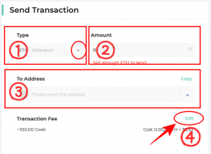 ①②③(人によっては④も)を入力したら、下にある「Send transaction」をクリックしてください。